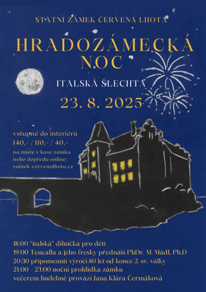 dovolte, abychom Vás srdečně pozvali na již každoročně pořádanou událost, kterou je Hradozámecká noc. Termín připadá na předposlední srpnovou sobotu, letos tedy na sobotu 23. 8. 2025.