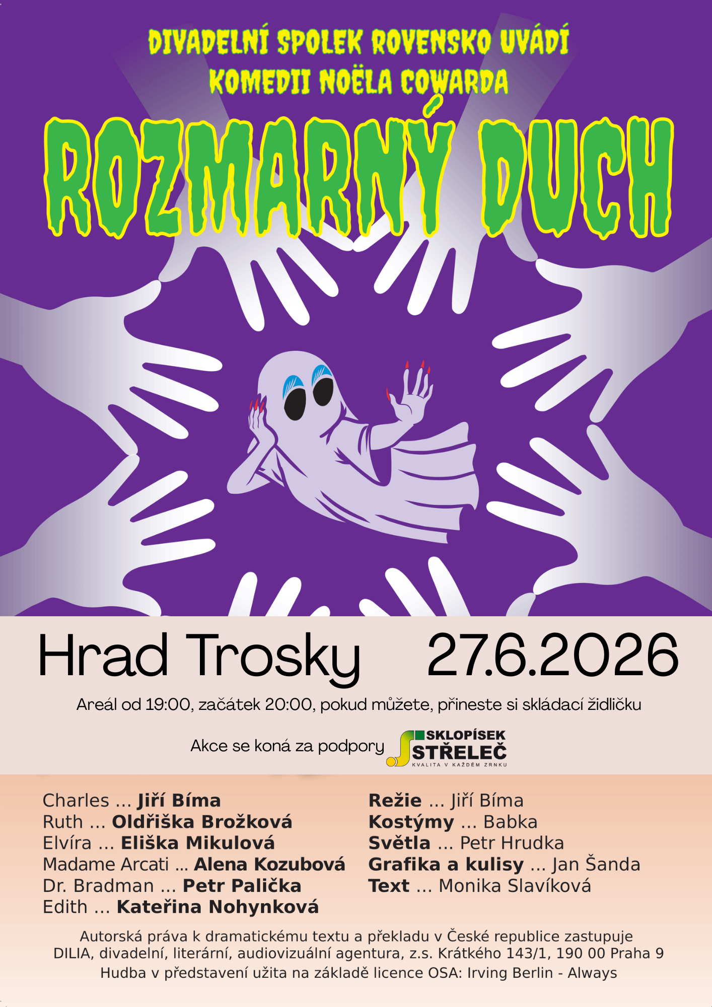Milá anglická duchařská komedie v podání SDO Rovensko pod Troskami. Hra Noëla Cowarda vypráví o tom, že není radno zahrávat si s okultními vědami, zvlášť když hlavní médium je poněkud potrhlé povahy. Pak se lehce může stát, že seriózní muž zažívá rodinné propletence, s nimiž si neví rady.