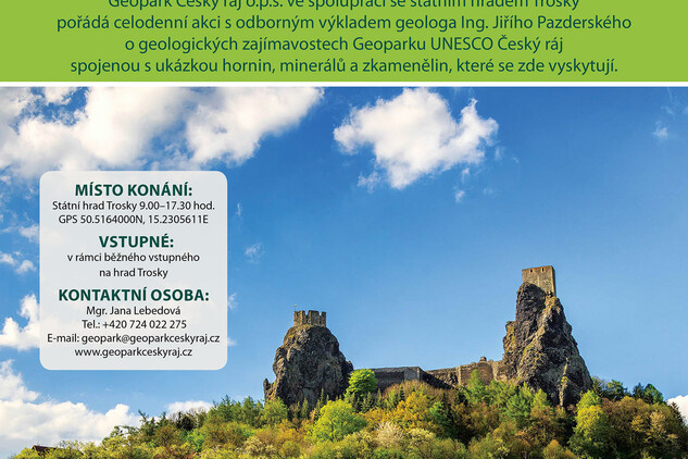 V rámci běžných prohlídek hradu se na druhém nádvoří dozvíte, jak vznikly skály, na kterých je postaven hrad Trosky, ale také na jakých třech geologicky odlišných územích se Geopark Český ráj rozpíná a proč je držitelem značky UNESCO. Prohlédnete si horniny a minerály, které zde vznikaly před desítkami až stovkami milionů let. Dnem Geoparku Vás budou celý den provázet ředitelka geoparku Jana Lebedová s geologem Jiřím Pazderským, kteří se postarají o odborný výklad pro všechny generace návštěvníků.